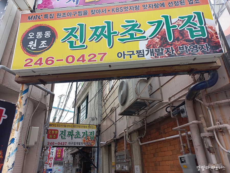 각설하고 아구찜을 처음으로 만들어서 판매했다는 진짜초가집으로 향합니다. 아구찜거리 큰길에서 골목으로 들어가야 합니다. 식당 이름에 원조와 진짜를 같이 사용했습니다. 하나의 음식을 시작했다는 것을 강조하는 듯한 인상을 받습니다. 옛날 식당에 보면 맛자랑 멋자랑에 나왔다고 소개하는 경우가 많습니다.