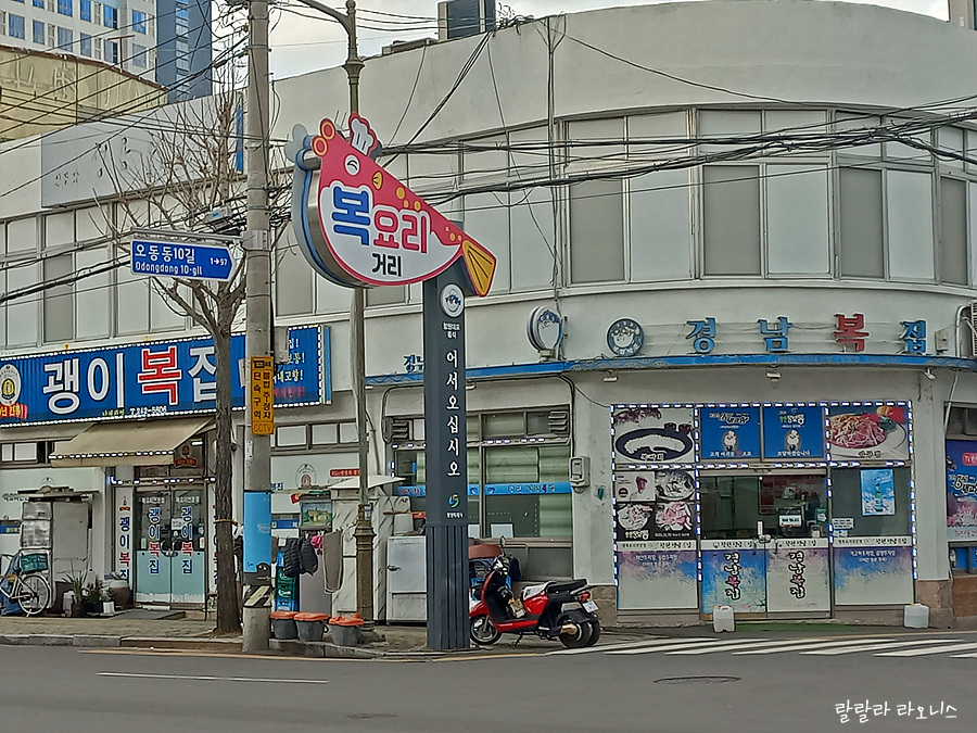 아구찜 잘 먹었습니다. 소화도 시킬 겸 거리를 걷습니다. 아구찜거리에서 길 건너면 복요리 거리입니다. 많은 복국집이 줄지어 있습니다. 마산에는 복요리거리(복집거리, 복국거리), 장어구이 등 음식 거리가 있습니다. 이들 거리가 가까이 있으니 먹부림 부려도 좋겠습니다.