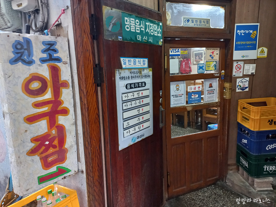 골목에서 조금만 들어가면 식당 입구가 나옵니다. 식당 입구만 보면 1960~70년대 분위기가 느껴집니다. 역사가 있는 노포 분위기입니다. 마산시 명물음식지정업소 글씨도 선명합니다. 마산이 한때는 대도시였고 큰 항구가 있다 보니 마산만의 먹거리가 있습니다. 마산오미는 아구, 미더덕, 복어, 전어, 국화주.