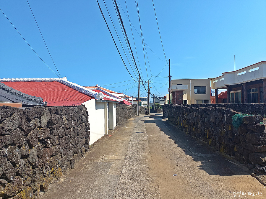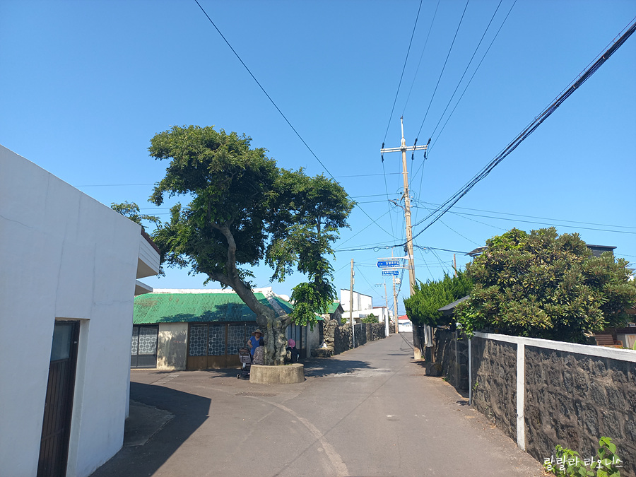 500m 정도는 가볍게 걸을 수 있습니다. 가다 보니까 무료 주차장이 또 있긴 하더군요. 멀찍이 주차하고 오길 잘했습니다. 길이 좁습니다. 차를 끌고 들어오면 저도 불편하고 동네 사람들에게도 민폐입니다. 마을 가운데 높게 뻗은 나무 그늘에서 아주머니들이 담소를 나눕니다. 알듯 모를듯한 제주도 사투리가 귀체 들어옵니다. 제주도에 온 것을 실감합니다.