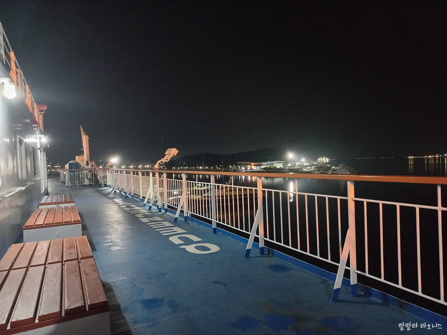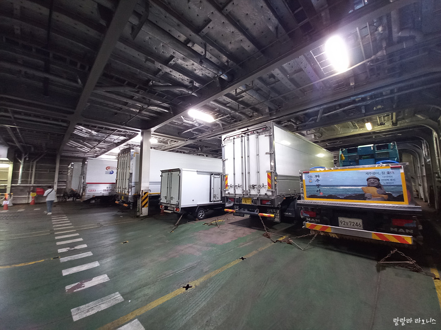 승선하니 자동차들이 실려 있는 곳을 지나갑니다. 커다란 화물차들이 많이 보입니다. 1톤 공차는 158,900원이 제일 저렴합니다. 추레라 일요일 요금 1,411,820원이 제일 비싸네요. 승용차 경차는 105,680원. 승합차 일요일 요금은 225,570원입니다. 평일 요금과 일요일 요금이 다릅니다. 인터넷으로 예약하면 비용이 좀 더 낮아집니다.