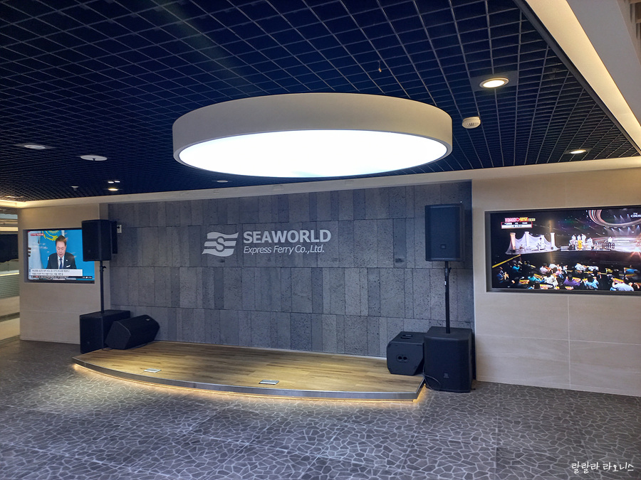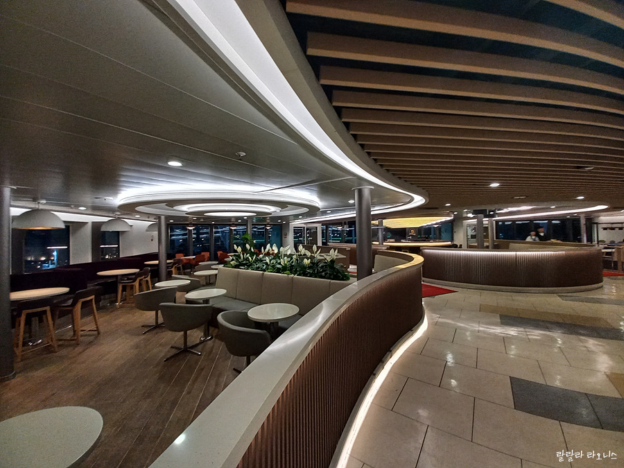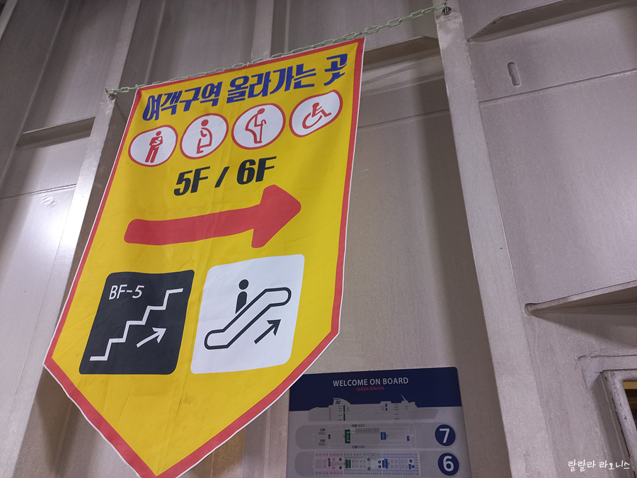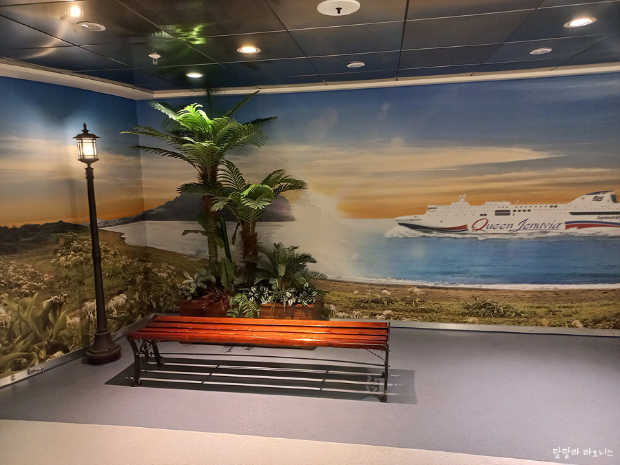 7층으로 올라왔습니다. 퀸제누비아호에 왔음을 확인시켜 줍니다. 퀸제누비아호는 현대미포조선에서 만들었습니다. 2020년 진수식을 하고 운항을 시작했으니 최신식 시설의 여객선입니다. 홍보 동영상에는 바다 위 5성급 호텔이라고 나오는군요. 제누비아는 제주로 가는 바닷길을 누비는 아름답고 멋진 카페리라는 뜻입니다.