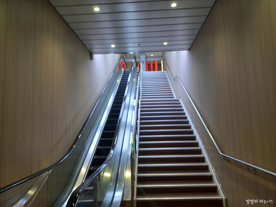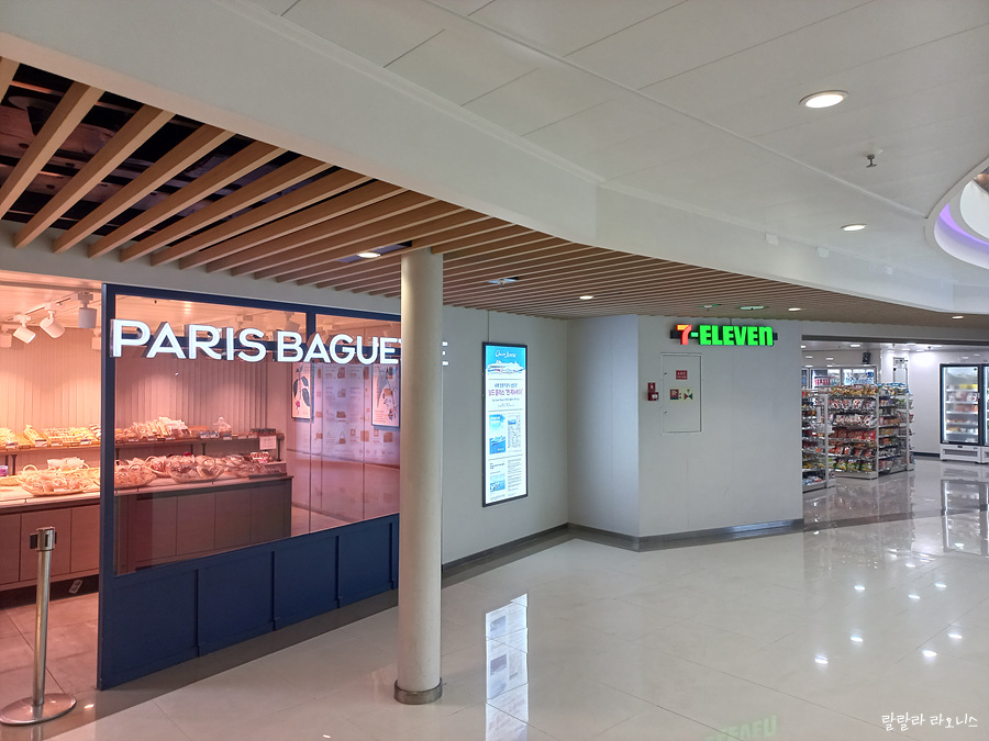 5층으로 올라와서 깜짝 놀랐습니다. 화물차 실려 있는 곳 지날 때는 어둡고 칙칙했습니다. 5층에 들어서는데 화이트톤으로 밝게 빛나는 것입니다. 파리바게트, 세븐이레븐 등 익숙한 상표의 상점이 보입니다. 빵집과 편의점이 이름만 걸려 있는 게 아닙니다. 매대에 상품이 많이 있습니다. 그만큼 수요가 있는 것으로 보입니다.