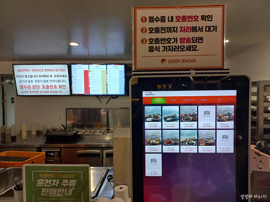 5층 식당. 메뉴가 다양합니다. 육개장, 돈가스, 미역국, 짜장면, 제육덮밥 등이 있습니다. 생맥주도 있습니다. 수제등심돈가스는 15,000원 완도소고기미역국 11,000원. 공깃밥 2,000원. 밤이기도 해서 그런지 식당 이용하는 사람은 없습니다. 다음날 아침에도 식사하는 사람은 보이지 않았습니다. 새벽이라 그럴 수도 있고요. 제주에서 목포 갈 때는 이용하는 경우가 있을 것 같습니다.