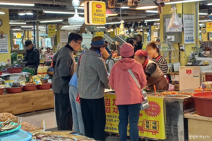 1층은 시장입니다. 시장이 실내여서 날씨 상관없이 물건 구매할 수 있습니다. 강화도의 농산물, 수산물 등 특산물도 쉽게 만날 수 있습니다. 겨울에는 고구마, 순무 김치 판매하는 곳이 여럿 있습니다. 어머니는 젓갈을 구매하십니다. 젓갈 가게 사장님이 장사를 잘하시네요. 강화풍물시장에서 우연히 KBS 박원숙 같이 삽시다 프로그램 촬영 현장을 봅니다.