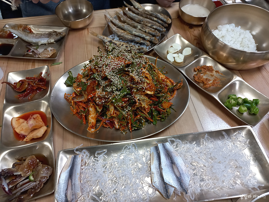 밴댕이모둠은 밴댕이를 이용한 회, 무침, 구이가 나옵니다. 밥 위에 밴댕이 무침을 넣어 비벼 먹을 수도 있습니다. 무침이 별미더군요. 반찬으로 나온 강화 순무김치도 반갑습니다. 생선구이는 별로.