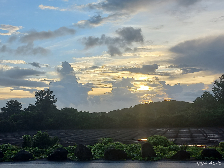 우도, 성산일출봉, 섭지코지 배경으로 해돋이를 보기 위해 대수산봉 오름에 올랐습니다. 구름이 많아서 수평선 위로 짠하고 올라오는 해돋이를 못 봤습니다. 제주도 동쪽 바다와 하늘을 맘껏 보았기에 아쉬움은 없습니다. 대수산봉에서 내려오는데 동쪽 하늘이 예쁩니다. 광치기해변을 가야겠습니다.