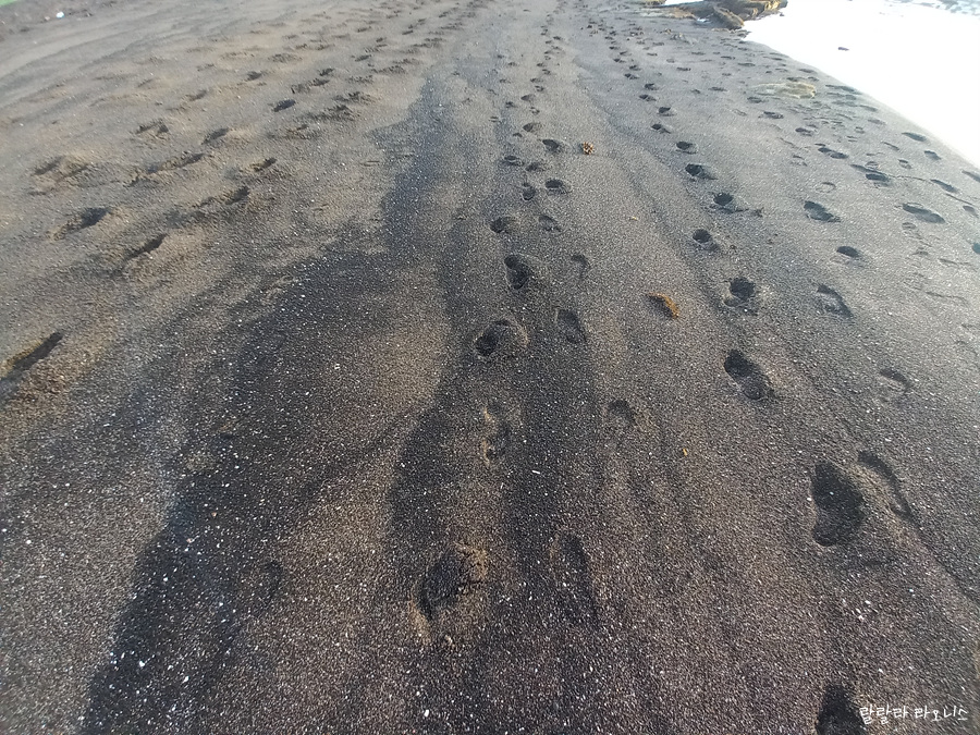 제주도 해변 중에는 모래가 검은색인 경우가 많습니다. 검은색의 현무암이 풍화작용을 거쳐 잘게 부서져 해변에 쌓인 것입니다. 광치기 해변의 경우 성산일출봉에서 나온 모래도 있을 것이고요. 사이사이 하얗게 보이는 것들은 조개가 부서진 것이 모래가 되어 해변으로 올라온 것입니다.