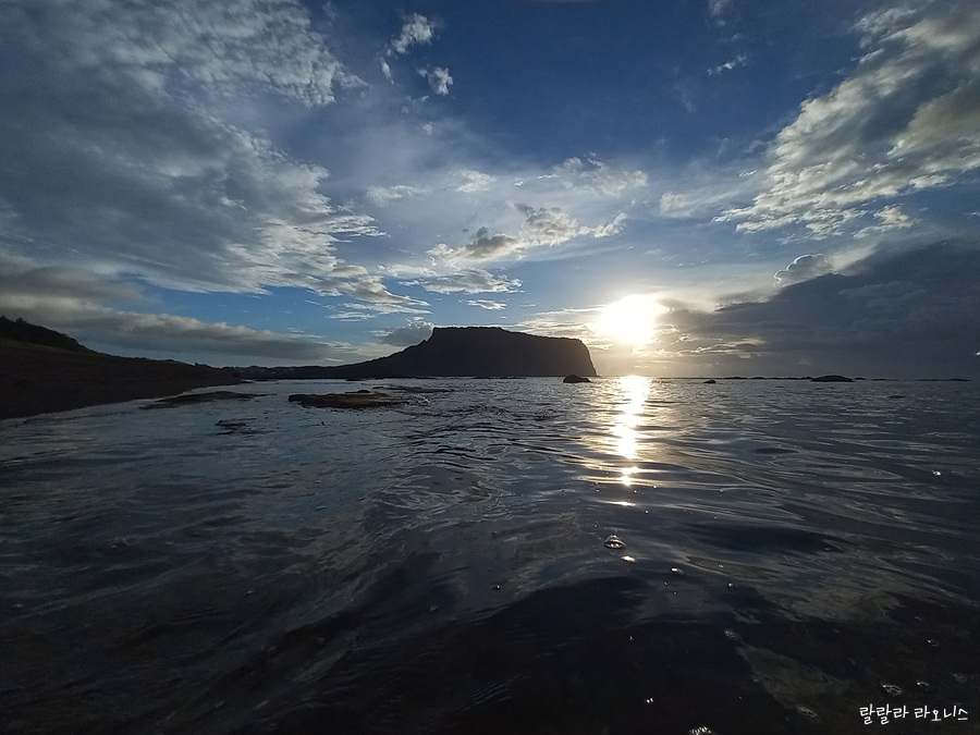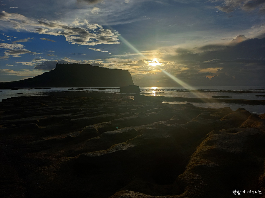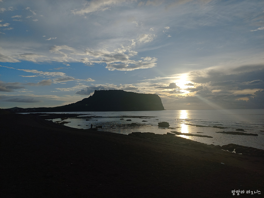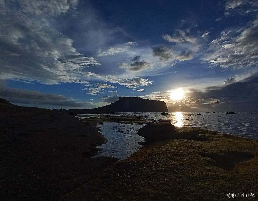 성산일출봉 위로 햇님이 많이 올라왔습니다. 성산(城山)이라는 이름 그대로 거대한 성의 모습이 보입니다. 밥그릇 닮은 것도 같고 코를 길게 뺀 코끼리 모습도 보입니다. 성산일출봉도 오름입니다. 섬이었습니다. 지금 보면 좌우의 모양이 다릅니다. 사진에서 오른쪽 부분은 파도에 닳고 닳아서 없어졌습니다. 닳고 닳은 부분은 지금의 광치기 해변 쪽으로 와서 쌓입니다.