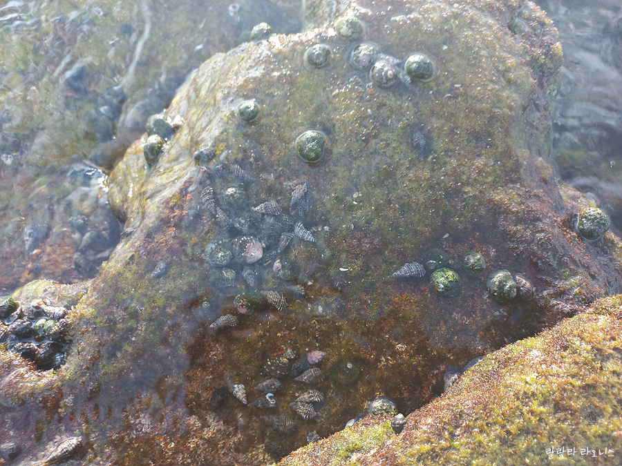 광치기해변에 물 빠졌을 때 초록 이끼 낀 바위 모습을 보고 놀라움을 표현한 경우가 많습니다. 지금은 물이 들어올 때라 바위가 많이 보이진 않습니다. 울퉁불퉁 바위에 초록 이끼가 있는 모습은 새로운 행성에 왔음 직한 상상을 불러일으킵니다.
