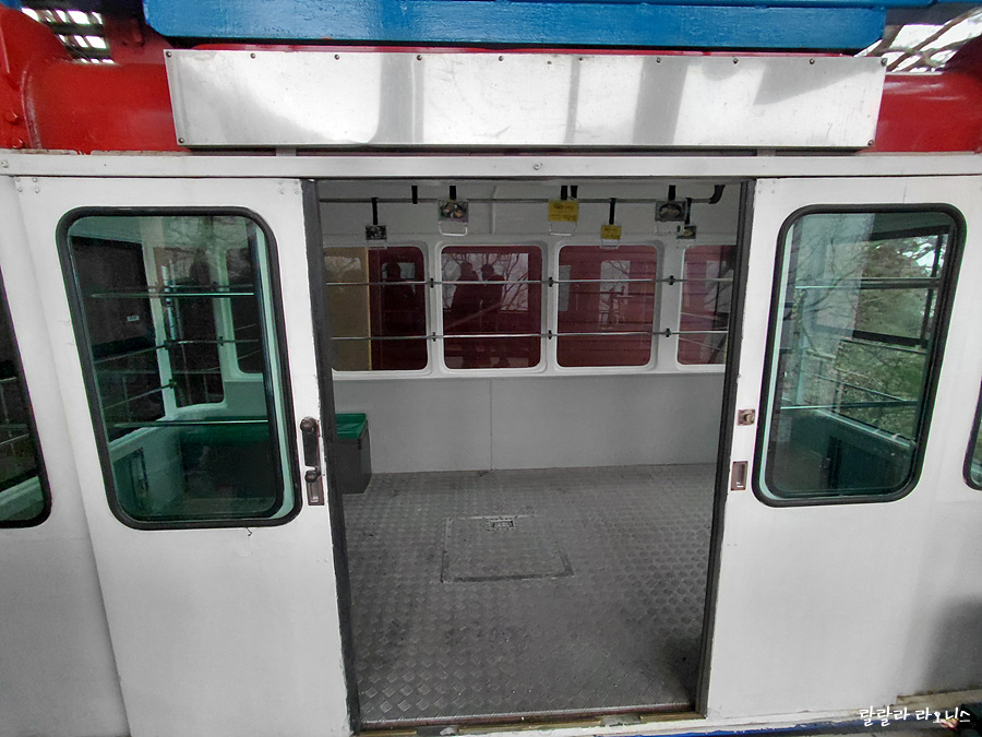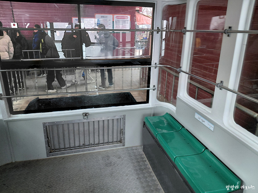 상부 승강장에 도착 후 승객 하차 후 내부를 살펴봅니다. 의자가 있긴 하지만 탑승 인원에 비하면 의자 수는 적습니다. 승객들이 어르신이나 아이에게 앉아 갈 수 있도록 배려해 줍니다. 최대 탑승 인원은 51명.