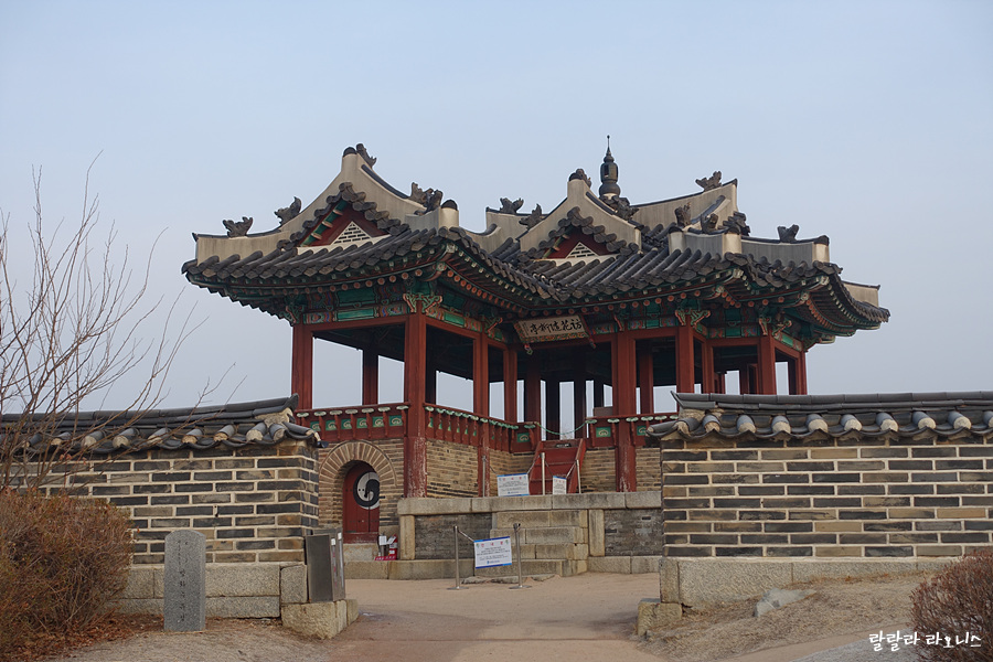 화홍문 바로 위에 방화수류정이 있습니다. 정식 명칭은 동북각루. 방화수류정(訪華隨柳亭)은 '꽃을 찾고 버드나무를 따라 노닌다'는 뜻입니다. 성곽은 군사시설입니다. 군사시설에 정자가 있고 뜻도 예쁩니다. 방화수류정 주변 경치가 뛰어나 휴식과 풍류를 즐길 수 있습니다.