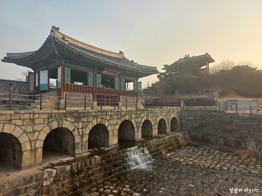 화홍문의 정식 이름은 북수문. 북쪽에 있는 수문입니다. 일곱 개의 아치가 무지개와 같다고 하여 화홍문이 불립니다. 빛나는(華) 무지개(虹). 겨울이라 수량이 적습니다. 여름이면 물이 꽤 많이 흐릅니다. 어떻게 아냐고요? 제가 5살 때 가족들이 화홍문 구경 왔습니다. 물이 엄청나게 흐르는 것이 무서워서 울고불고했던 것을 기억합니다.